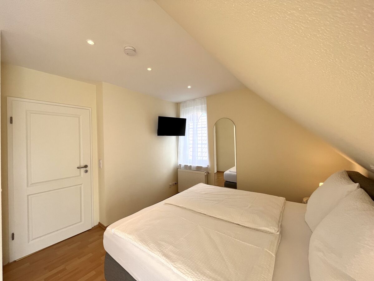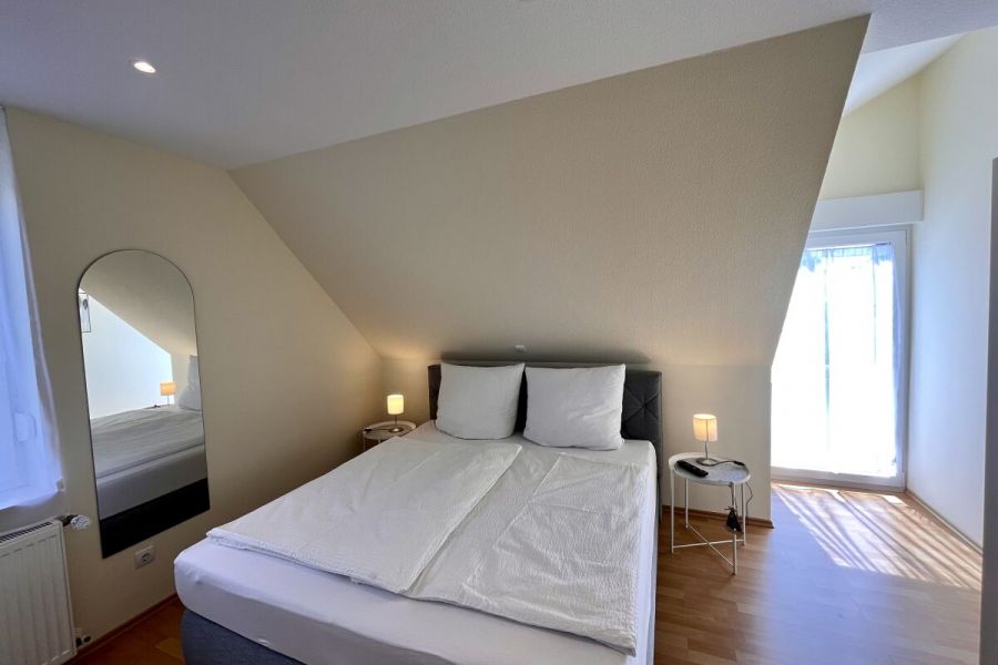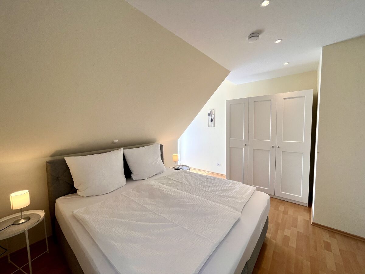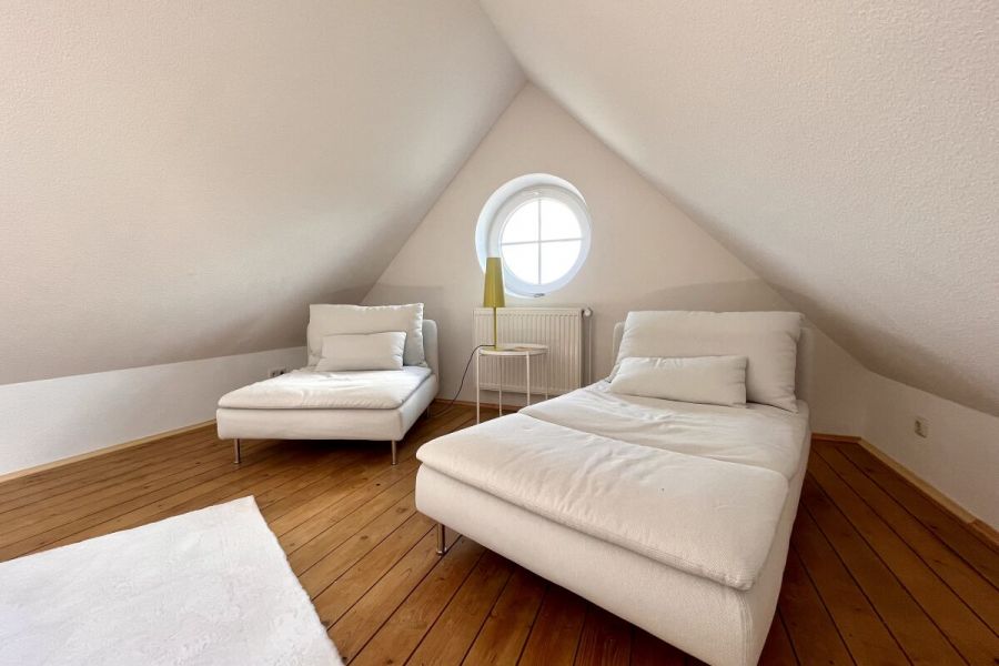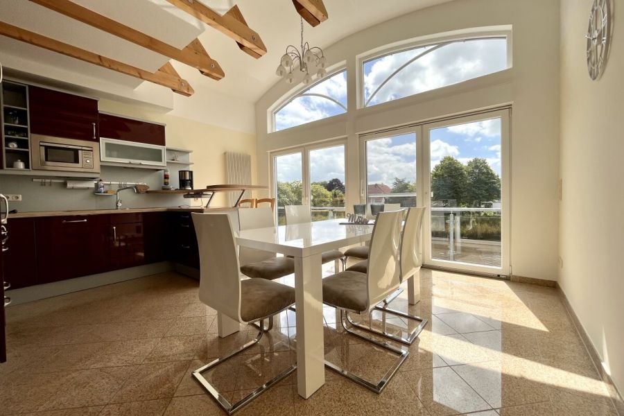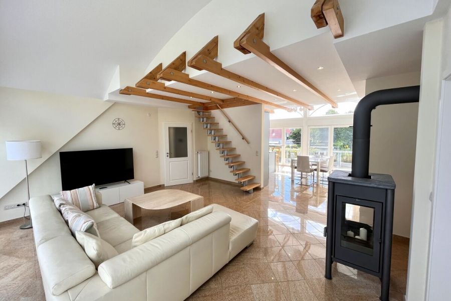 Die Wohnung ist in 2022 komplett neu renoviert worden und beherbergt in der ersten Etage, zwei Schlafzimmer. Diese sind jeweils mit einem großen Boxspringbett und einem TV- Gerät ausgestattet. Besonders hervorhebend ist hier, dass eines der zwei Schlafzimmer, ein eigenes Badezimmer mit Wellnessdusche und einem begehbaren Kleiderschrank verfügt. Von beiden Schlafzimmern aus, gelangen Sie auf den Balkon, der Ihnen einen einzigartigen Blick, auf den Hafen von Carolinensiel bietet. Für das Mobile Arbeiten im Urlaub oder dem Besuch der ganzen Familie, steht ein Büro und ein zweites Badezimmer mit Dusche, zur Verfügung. Das Schmuckstück der Wohnung, ist der Wohn- und Essbereich, mit offener Küche. Hier können Sie sich bei angestellter Fußbodenheizung oder am schönem Kaminofen, entspannen. Die Küche ist mit einer Spülmaschine, einer Mikrowelle und allem weiteren Utensilien eingerichtet, was man zur Bewältigung des Alltages benötigt. Vom Wohnbereich, der natürlich auch mit einem großen TV-Gerät ausgestattet ist, gelangen Sie auf den zweiten Balkon, der den Blick auf den Hinterhof des Hauses bietet. Der ausgebaute Spitzboden bietet Ihnen einen kleinen Ruhebereich mit bequemen Möbeln und ein Boxspringbett für zwei weitere Personen.