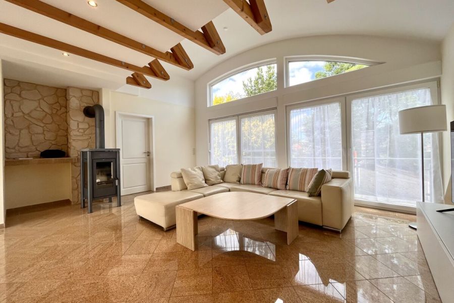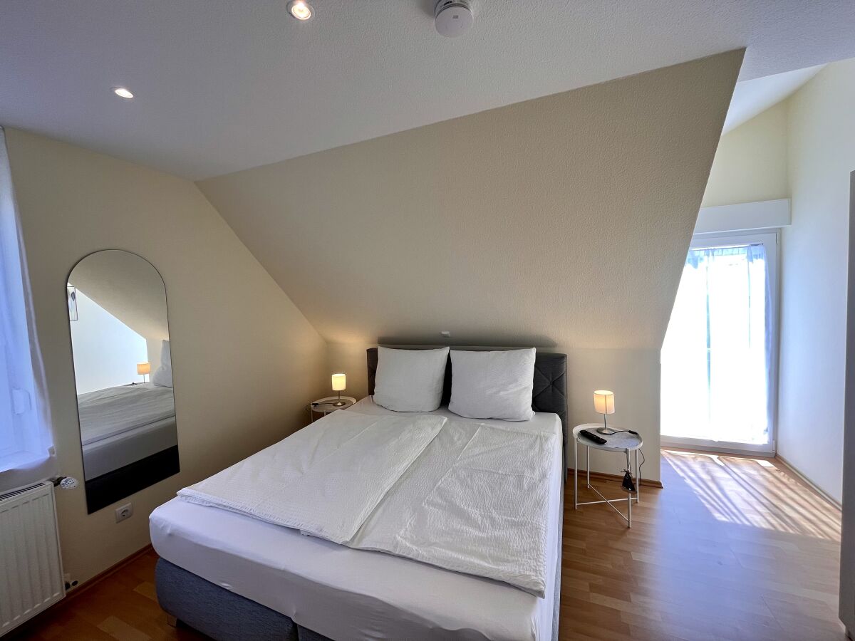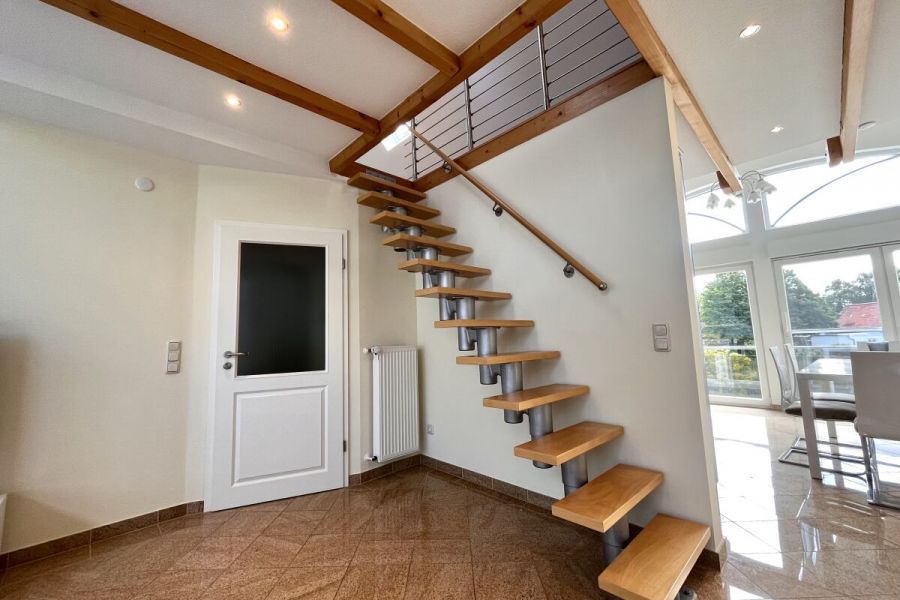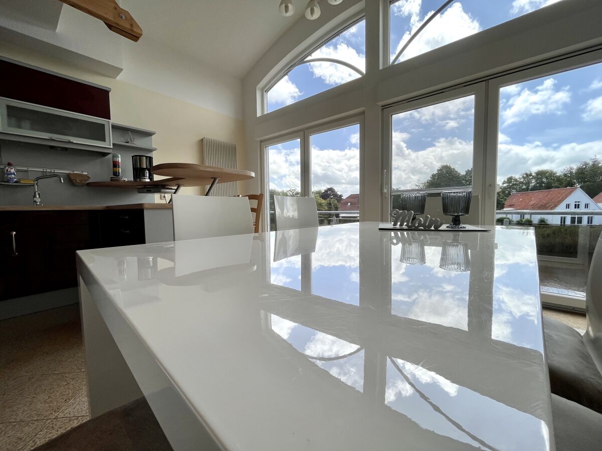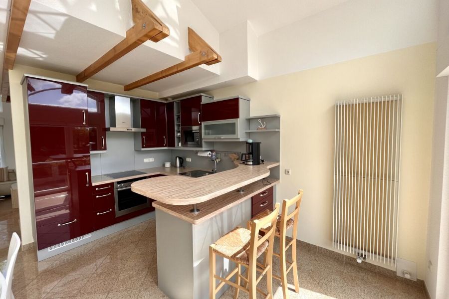 Die Wohnung ist in 2022 komplett neu renoviert worden und beherbergt in der ersten Etage, zwei Schlafzimmer. Diese sind jeweils mit einem großen Boxspringbett und einem TV- Gerät ausgestattet. Besonders hervorhebend ist hier, dass eines der zwei Schlafzimmer, ein eigenes Badezimmer mit Wellnessdusche und einem begehbaren Kleiderschrank verfügt. Von beiden Schlafzimmern aus, gelangen Sie auf den Balkon, der Ihnen einen einzigartigen Blick, auf den Hafen von Carolinensiel bietet. Für das Mobile Arbeiten im Urlaub oder dem Besuch der ganzen Familie, steht ein Büro und ein zweites Badezimmer mit Dusche, zur Verfügung. Das Schmuckstück der Wohnung, ist der Wohn- und Essbereich, mit offener Küche. Hier können Sie sich bei angestellter Fußbodenheizung oder am schönem Kaminofen, entspannen. Die Küche ist mit einer Spülmaschine, einer Mikrowelle und allem weiteren Utensilien eingerichtet, was man zur Bewältigung des Alltages benötigt. Vom Wohnbereich, der natürlich auch mit einem großen TV-Gerät ausgestattet ist, gelangen Sie auf den zweiten Balkon, der den Blick auf den Hinterhof des Hauses bietet. Der ausgebaute Spitzboden bietet Ihnen einen kleinen Ruhebereich mit bequemen Möbeln und ein Boxspringbett für zwei weitere Personen.