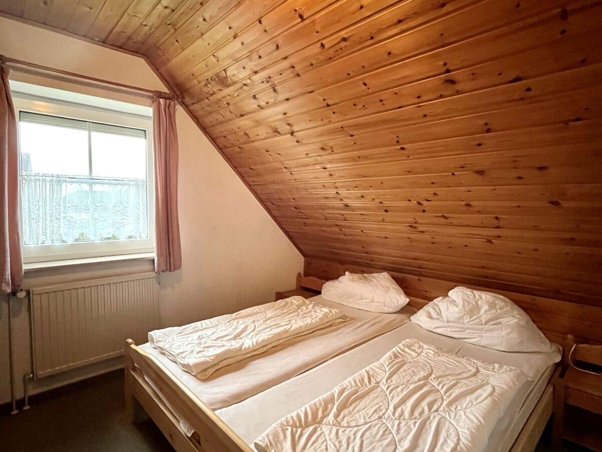 Im Obergeschoss gibt es 3 Schlafzimmer. Zwei Schlafzimmer sind mit Doppelbett und eins mit einem Etagenbett eingerichtet. Auch hier gibt es ein Badezimmer mit Dusche und WC.