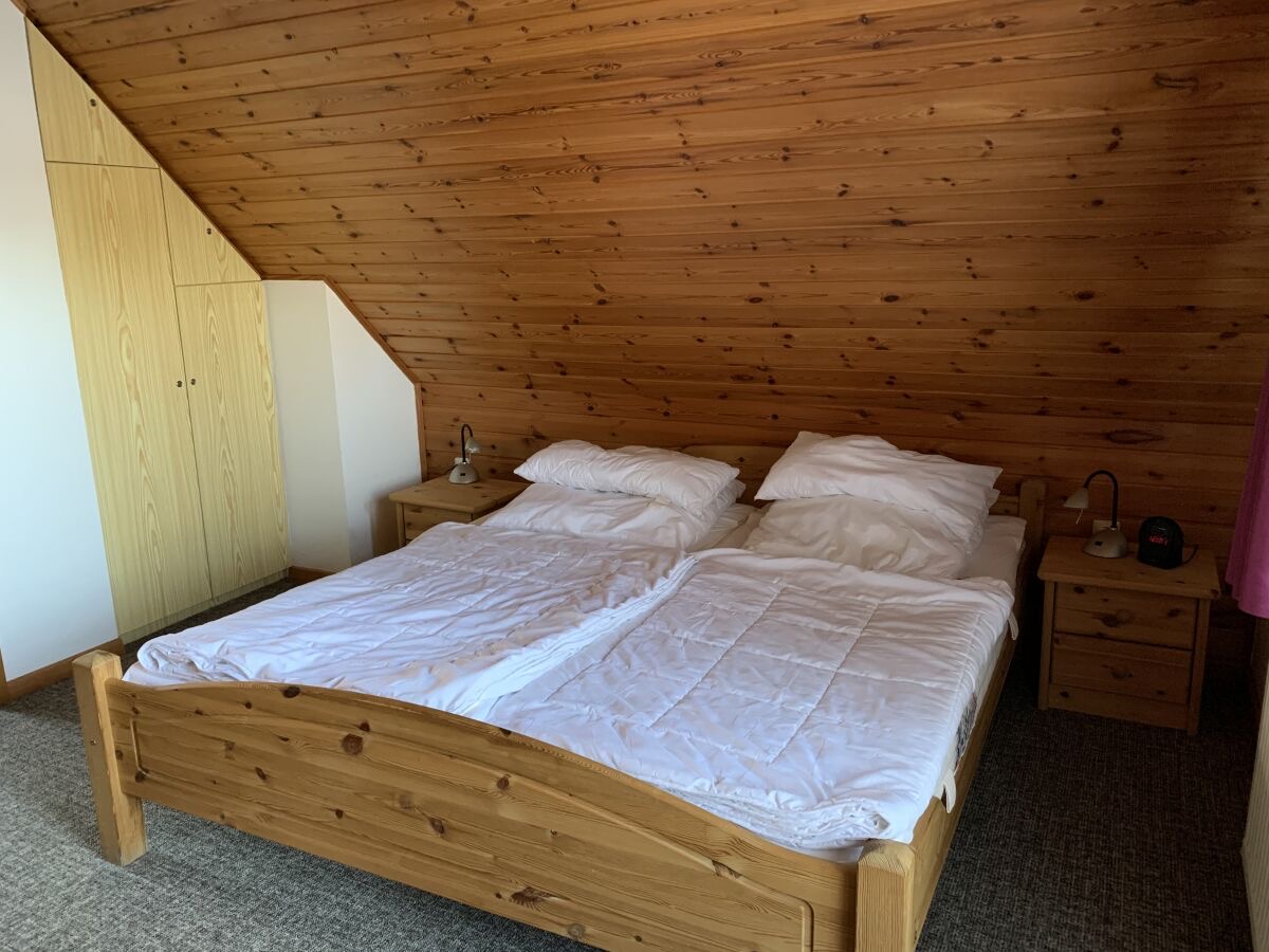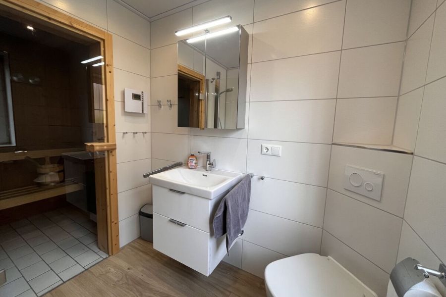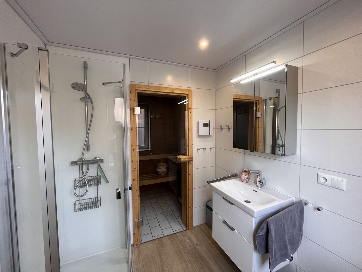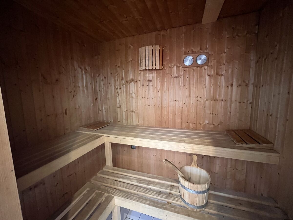 Im unteren Bereich befindet sich der Wohn-und Essbereich mit anliegender gut ausgestatteter Küchenzeile. Weiter Im Erdgeschoss befindet sich ein Badezimmer mit Dusche und Waschmaschine sowie ein Schlafzimmer mit einem Hochbett. Zwei weitere Schlafräume, eines mit Doppelbett und eines mit zwei Einzelbetten, sowie ein Kinderreisebett und ein Gäste-WC sind in der 1.Etage. Highlight ist die Hauseigene Sauna.